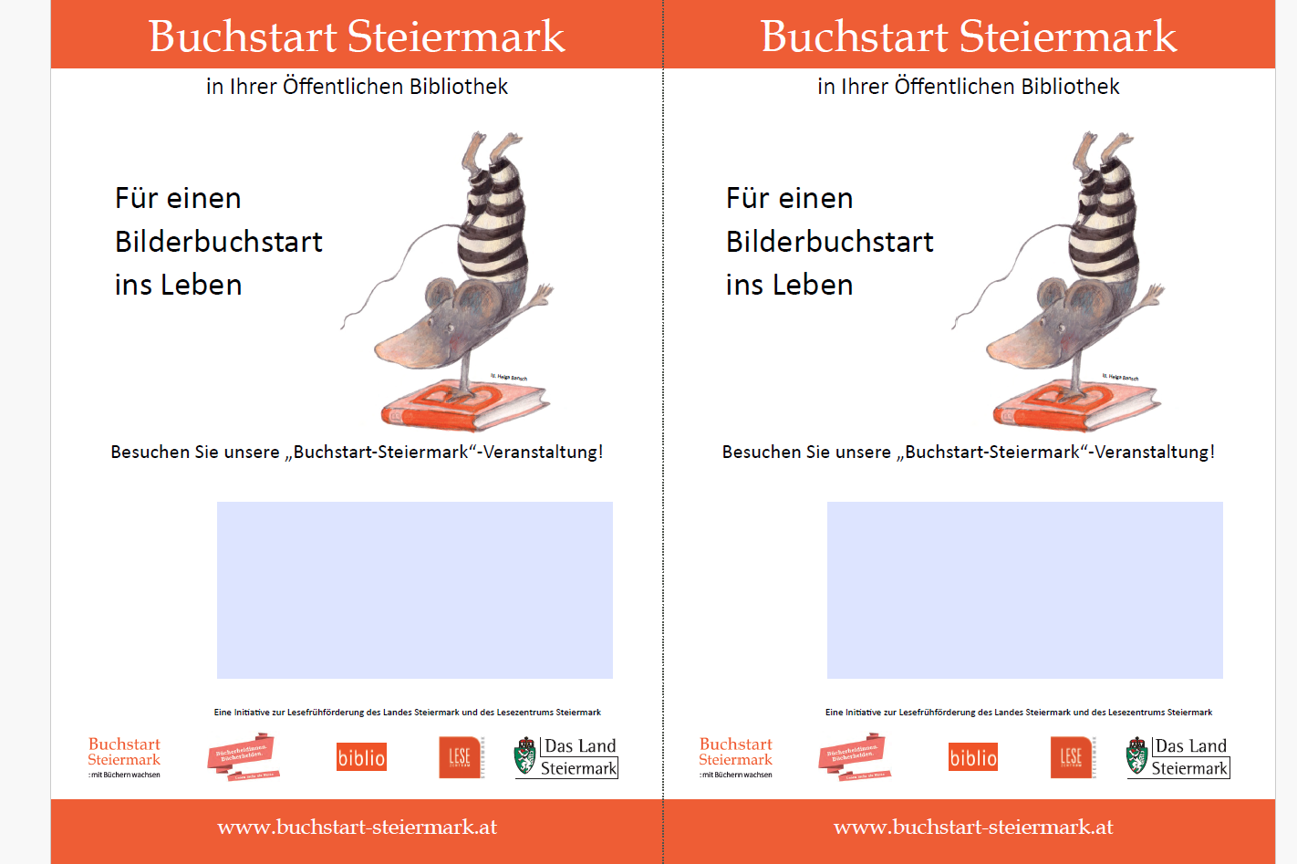 Der „Buchstart Steiermark“-Veranstaltungsflyer in A5 kann von allen teilnehmenden Bibliotheken im Rahmen der Öffentlichkeitsarbeit verwendet werden. Auf einer A4-Seite befinden sich zwei A5-Veranstaltungsflyer zum Ausdrucken.