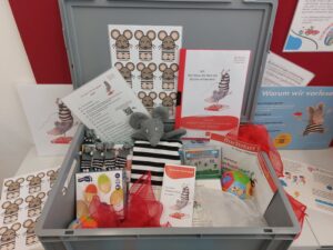 Ebenso enthält die Mio Maus-Werkzeugkiste Plakate und diverses Informationsmaterial zu „Buchstart Steiermark“-Veranstaltungen, zu Büchertipps, Reimen und Kniereitern.